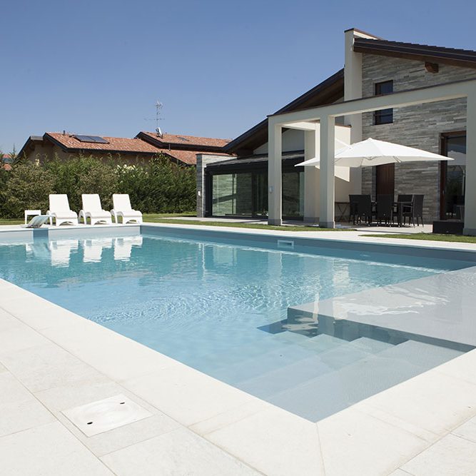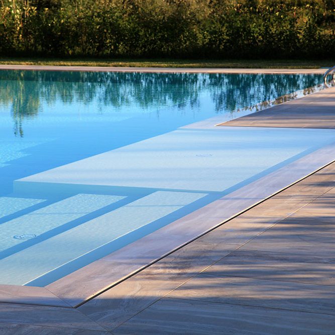 –Scala romana: un ingresso a gradoni ampio e scenografico, posto di solito sul lato corto della piscina